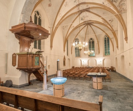 Mooi gelegen in het centrum van Raalte omgeven door horeca als baken en vertrouwd beeld van alle tijden. Verbonden met die oude tijd vinden we secco ’s aan het gewelf en zien we de contouren van Franciscus van Assisi. We kunnen rijk vertellen over dat verleden bijvoorbeeld over de betrokkenheid van de landgoederen, zie de Herenbanken, waaronder het landgoed Schoonheten waar ook nu goede contacten mee zijn.