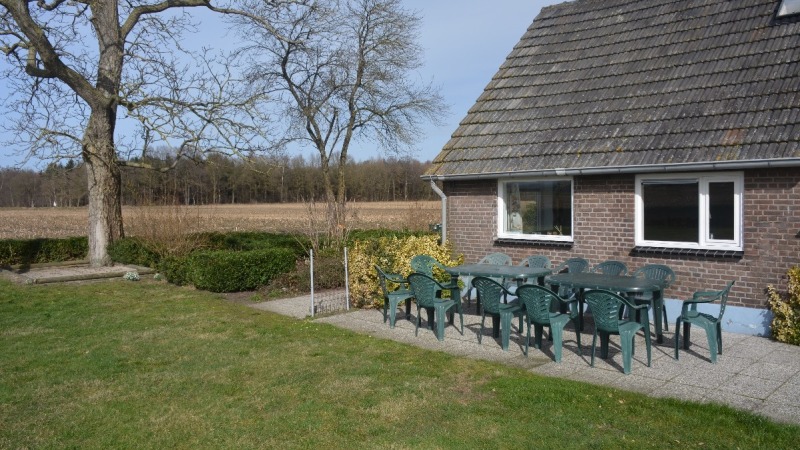 Grasveld waar de hele dag zon is behalve onder de appelboom is schaduw. Hier kan men voet- en/of volleyballen. Terras, zandbak en schommel aanwezig. Aan de ene kant van het huis kijk je de weilanden in en aan de andere kant is het bos. Ruime parkeergelegenheid.